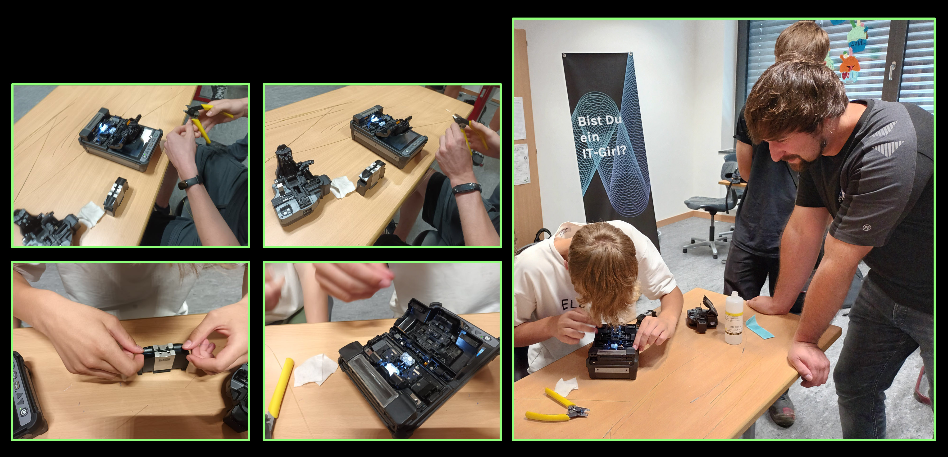 Dann ging es in die Praxis. Die Schülerinnen und Schüler lernten ein Spleißgerät kennen, eine Maschine, mit der man Glasfasern für Kabel verbindet. Zunächst wurden Funktion und Einsatzmöglichkeiten des Geräts und seine Funktionsweise erklärt. Dann konnten die Schülerinnen und Schüler mit Unterstützung von Maksymilian Bartozewicz und Daniel Grittner praktisch an dem Spleißgerät arbeiten und Glasfaserkabel miteinander verschmelzen. Und so erste Erfahrungen in einem handwerklich ausgerichteten IT-Beruf sammeln. Vertieft wurden diese durch die Bearbeitung und Auflösung eines Aufgabenblattes zum Thema Spleißen.